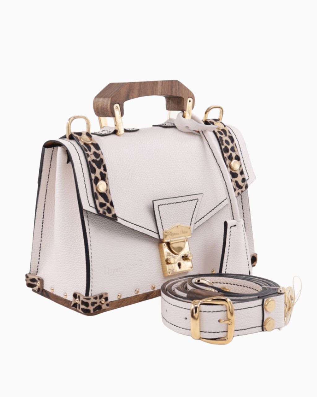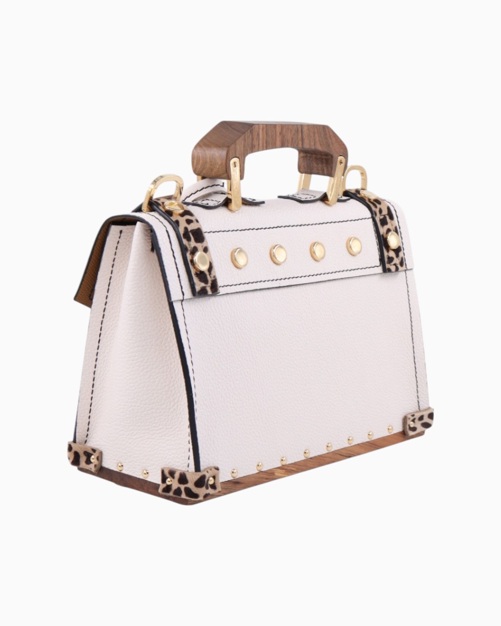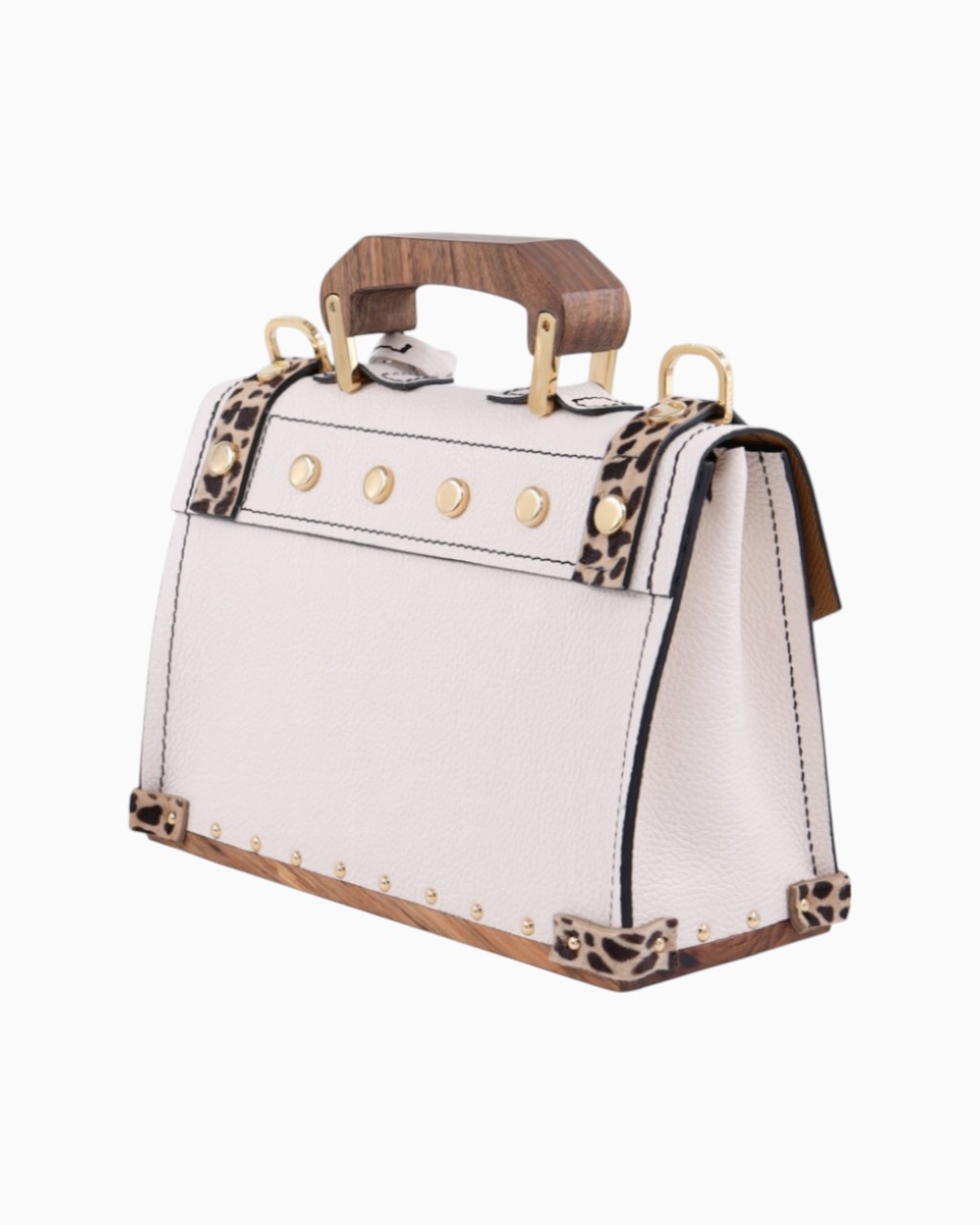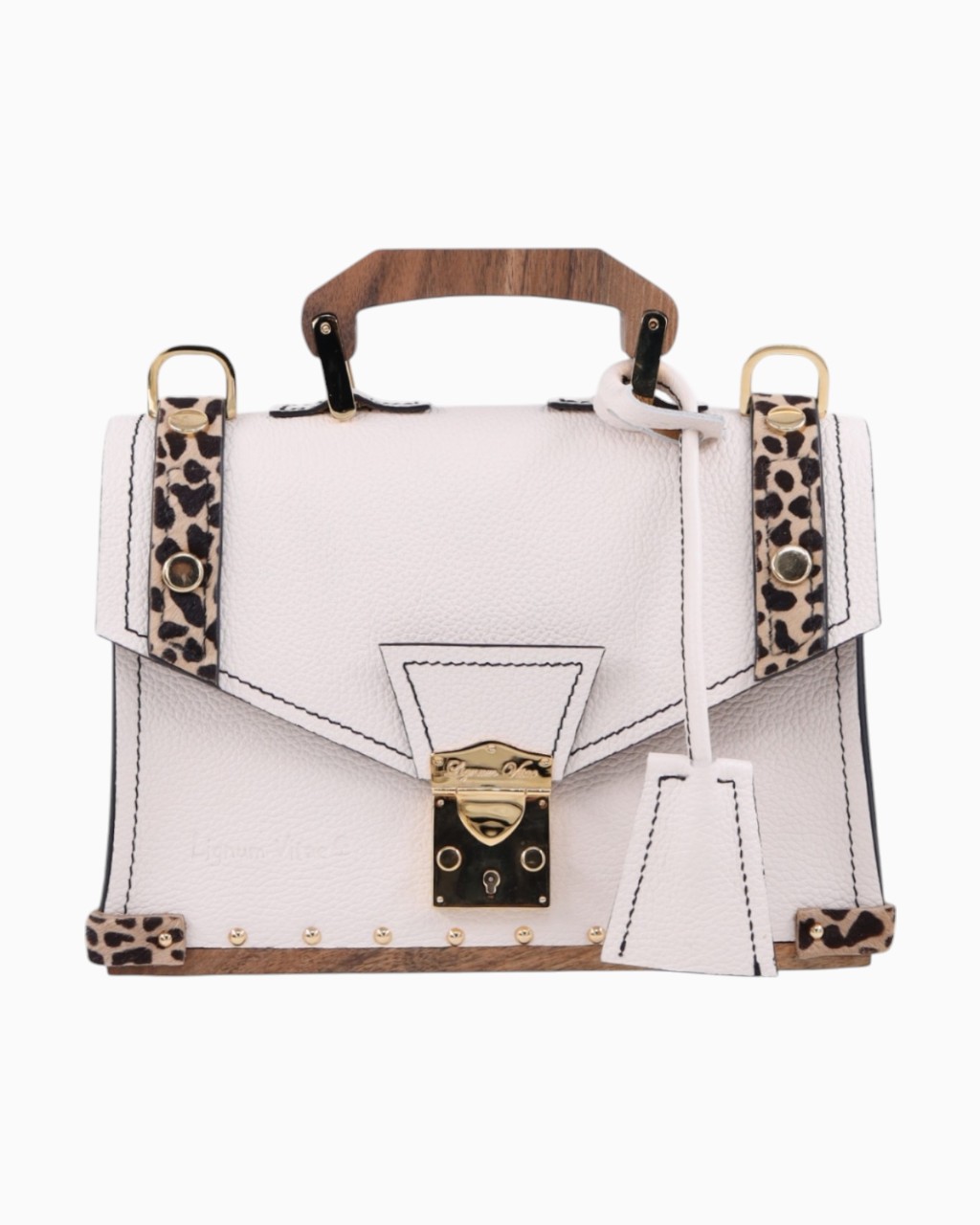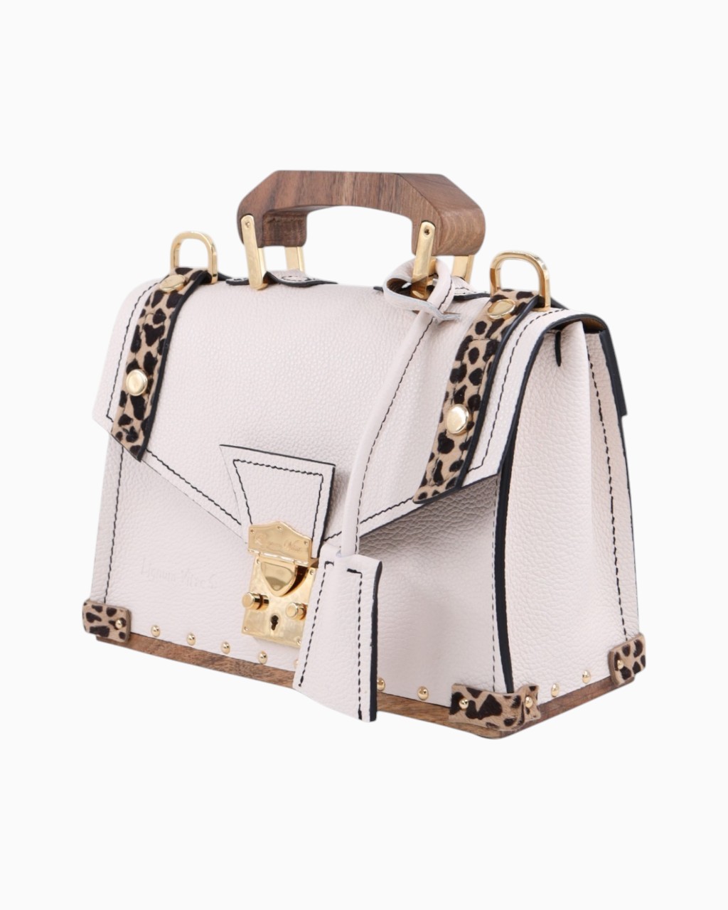 Corps en cuir blanc cassé, rehaussé de sangles à motif léopard.