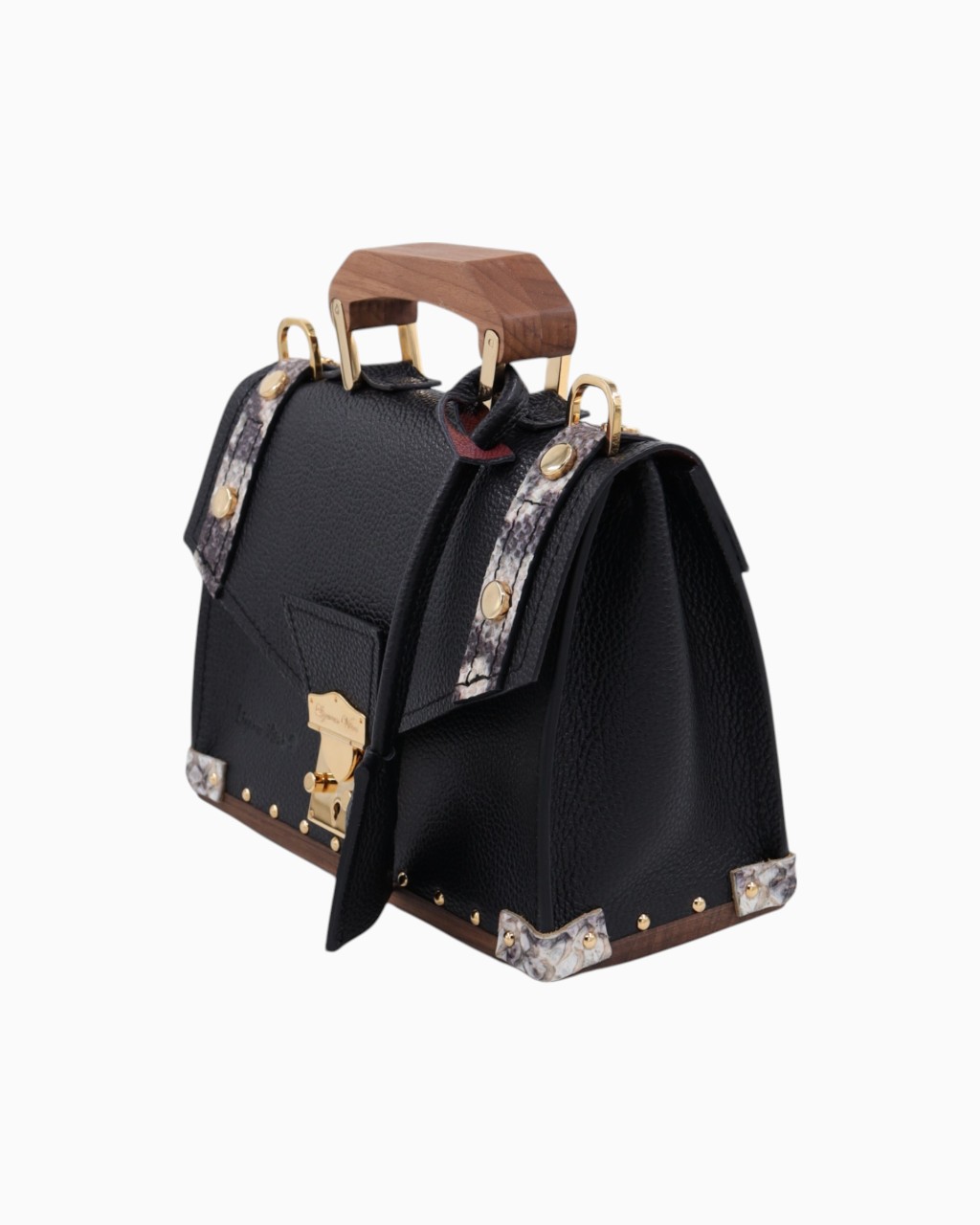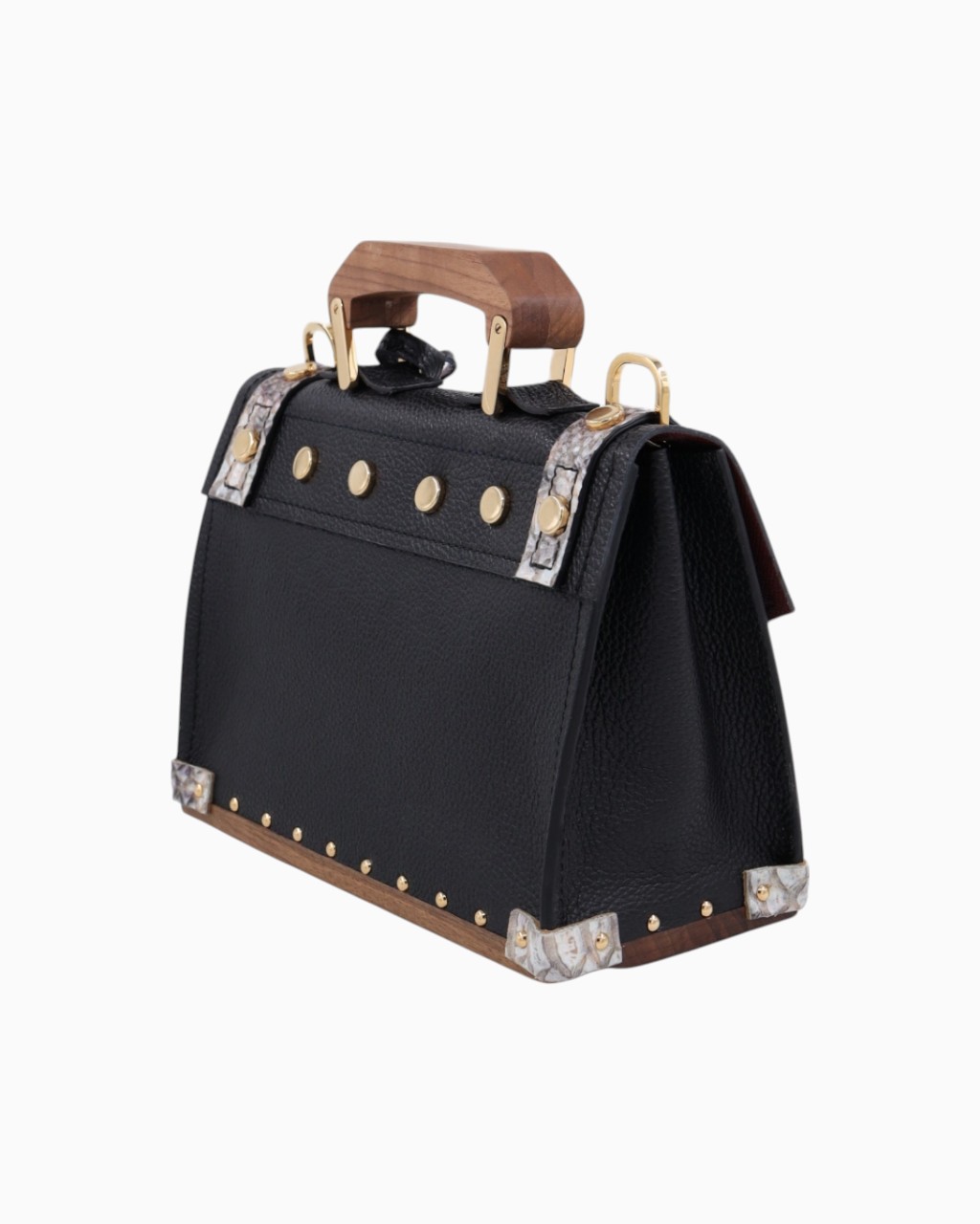 Ce sac est confectionné avec un cuir italien grainé de la plus haute qualité, doublé sur ses deux faces pour une finition impeccable. Le fond, la poignée et la boucle de la bandoulière sont réalisés en bois de noyer, apportant une signature naturelle et élégante. Les détails métalliques, tels que le fermoir, la boucle, les mousquetons, les anneaux et les clous, sont sublimés par un placage en or 24 carats, témoignant d'un souci constant du détail.