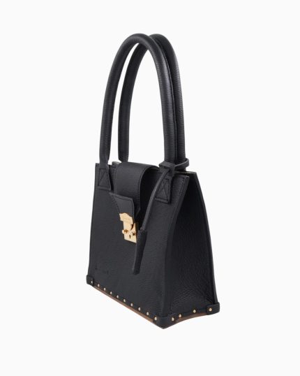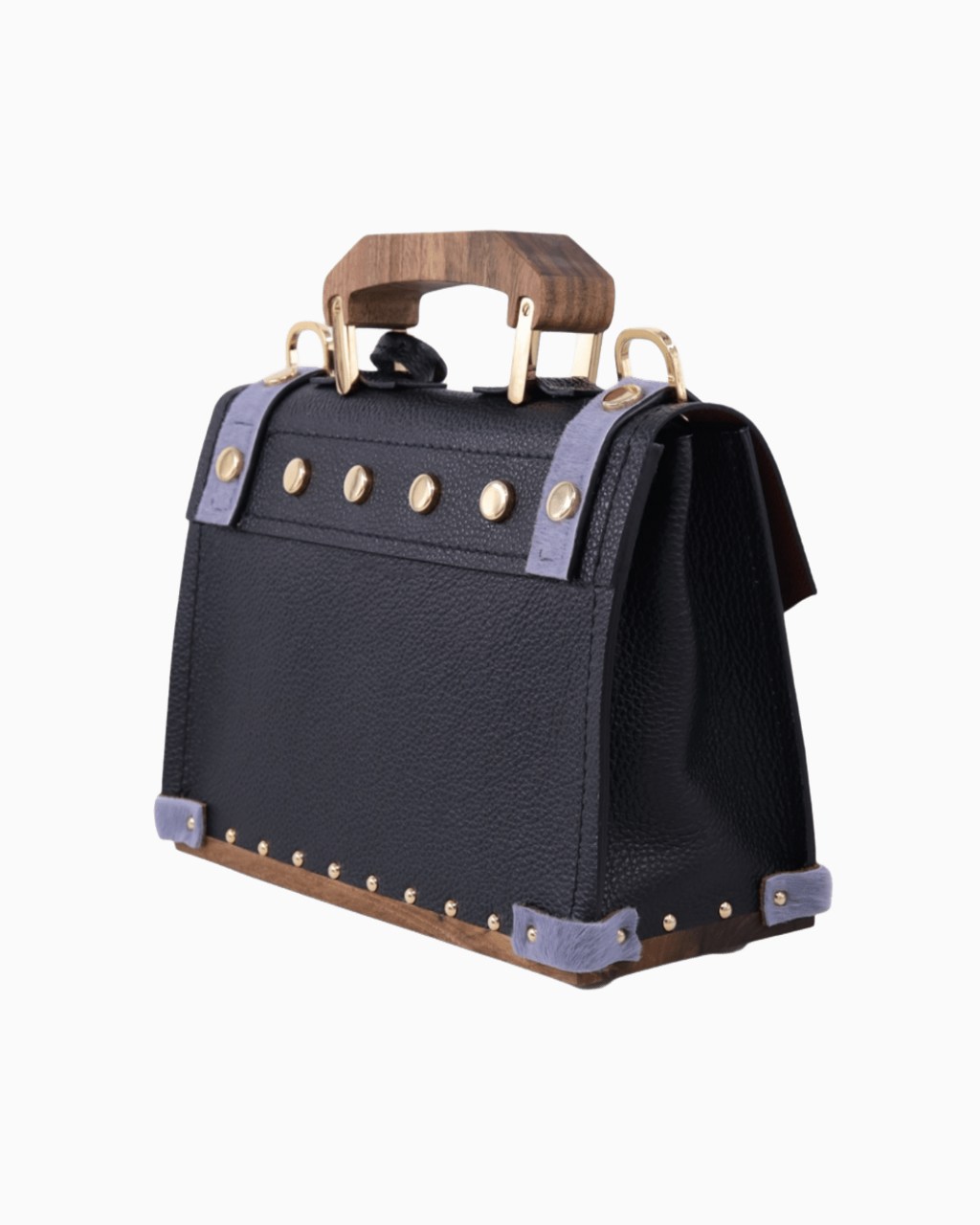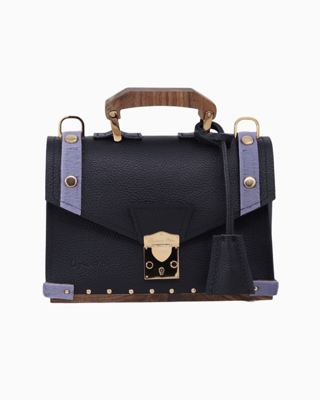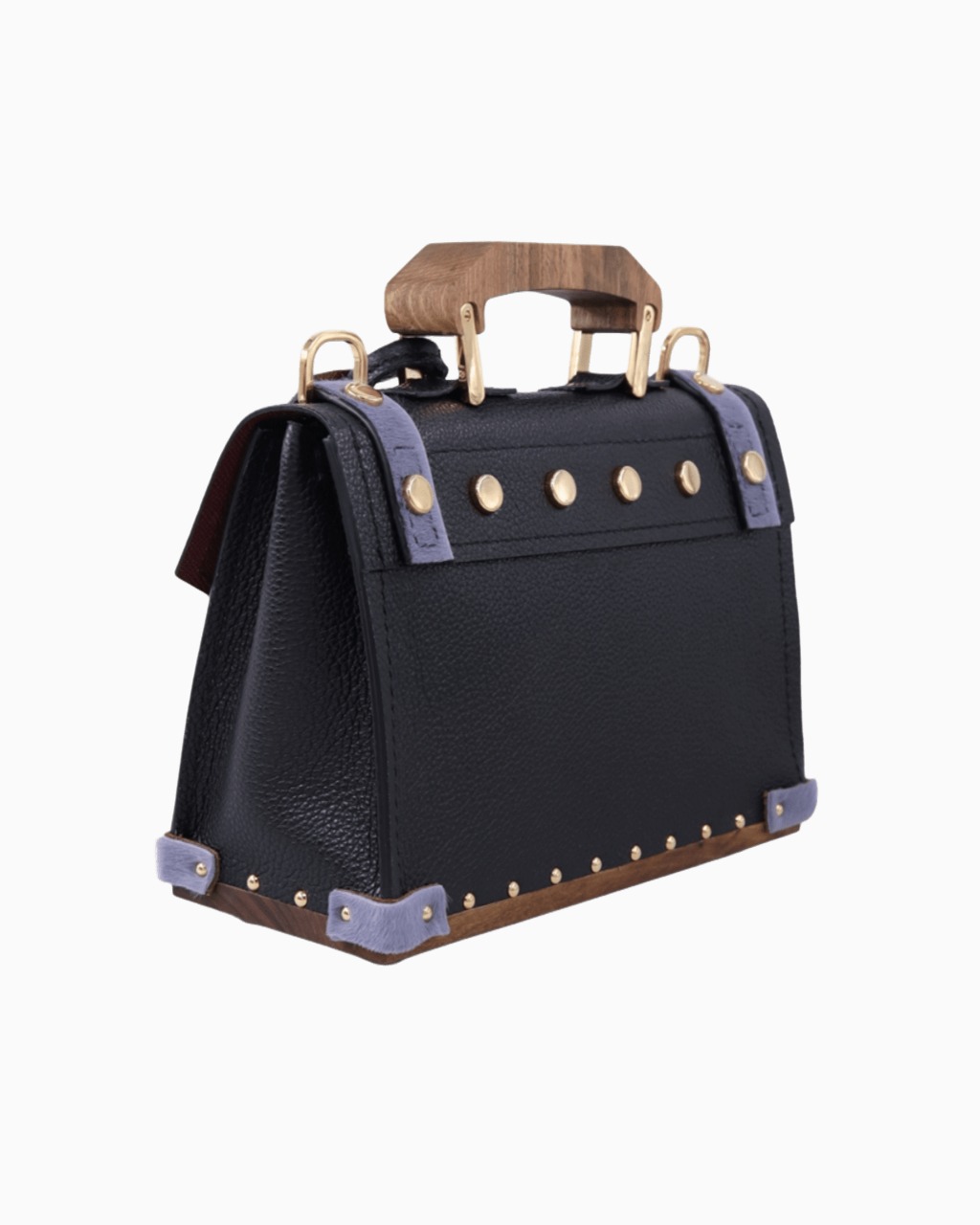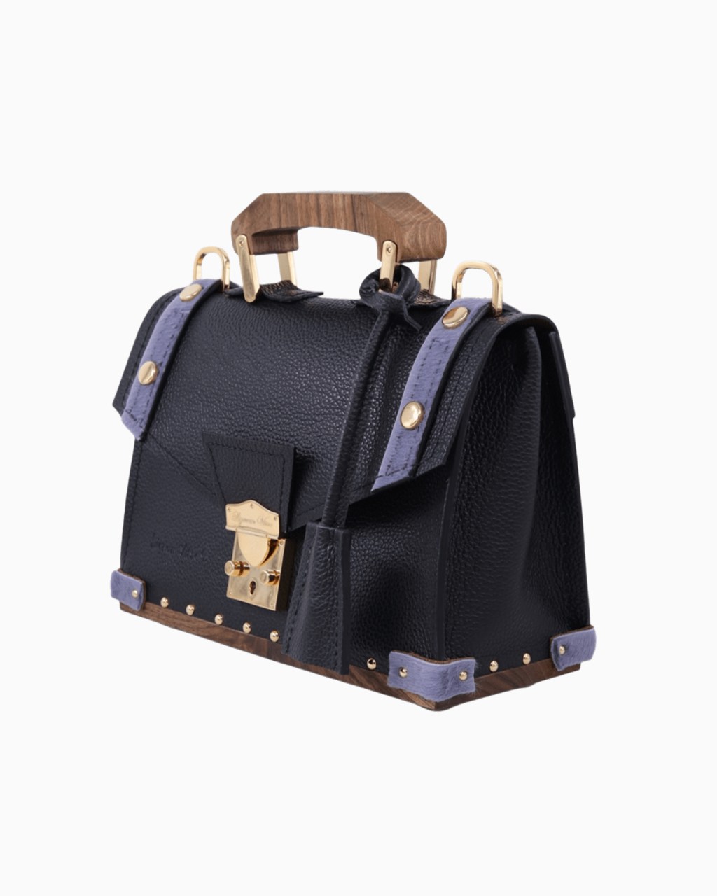 Ce sac est confectionné avec un cuir italien grainé de la plus haute qualité, doublé sur ses deux faces pour une finition impeccable. Le fond, la poignée et la boucle de la bandoulière sont réalisés en bois de noyer, apportant une signature naturelle et élégante. Les détails métalliques, tels que le fermoir, la boucle, les mousquetons, les anneaux et les clous, sont sublimés par un placage en or 24 carats, témoignant d'un souci constant du détail.
