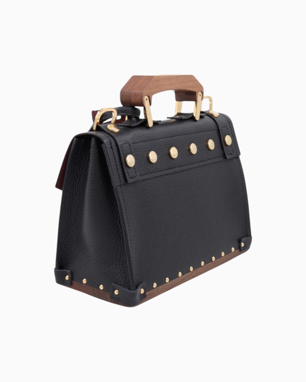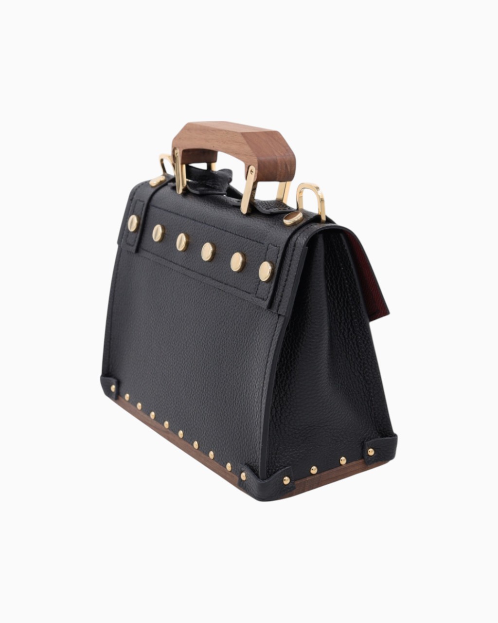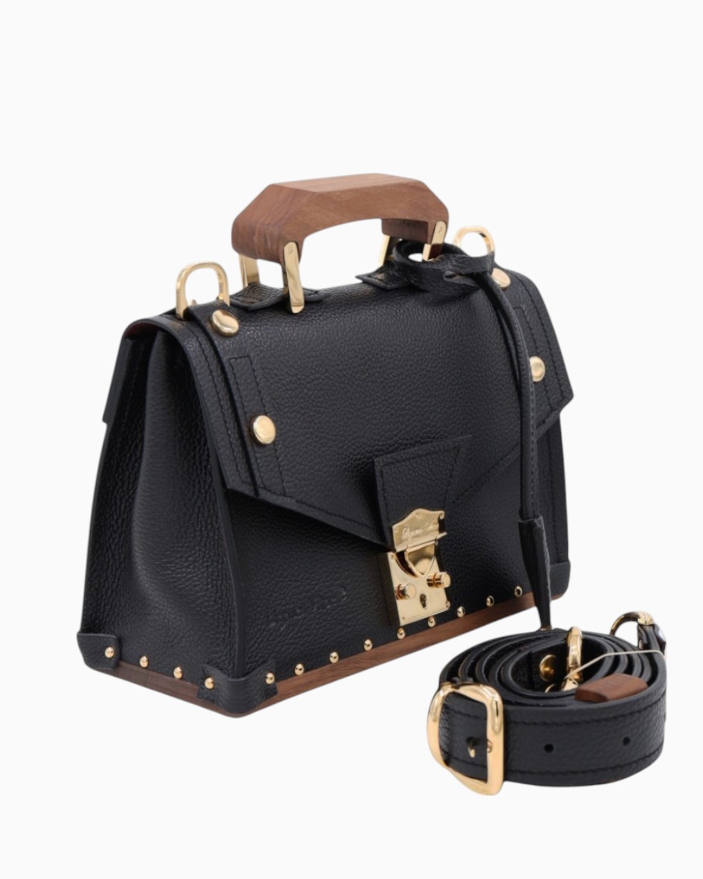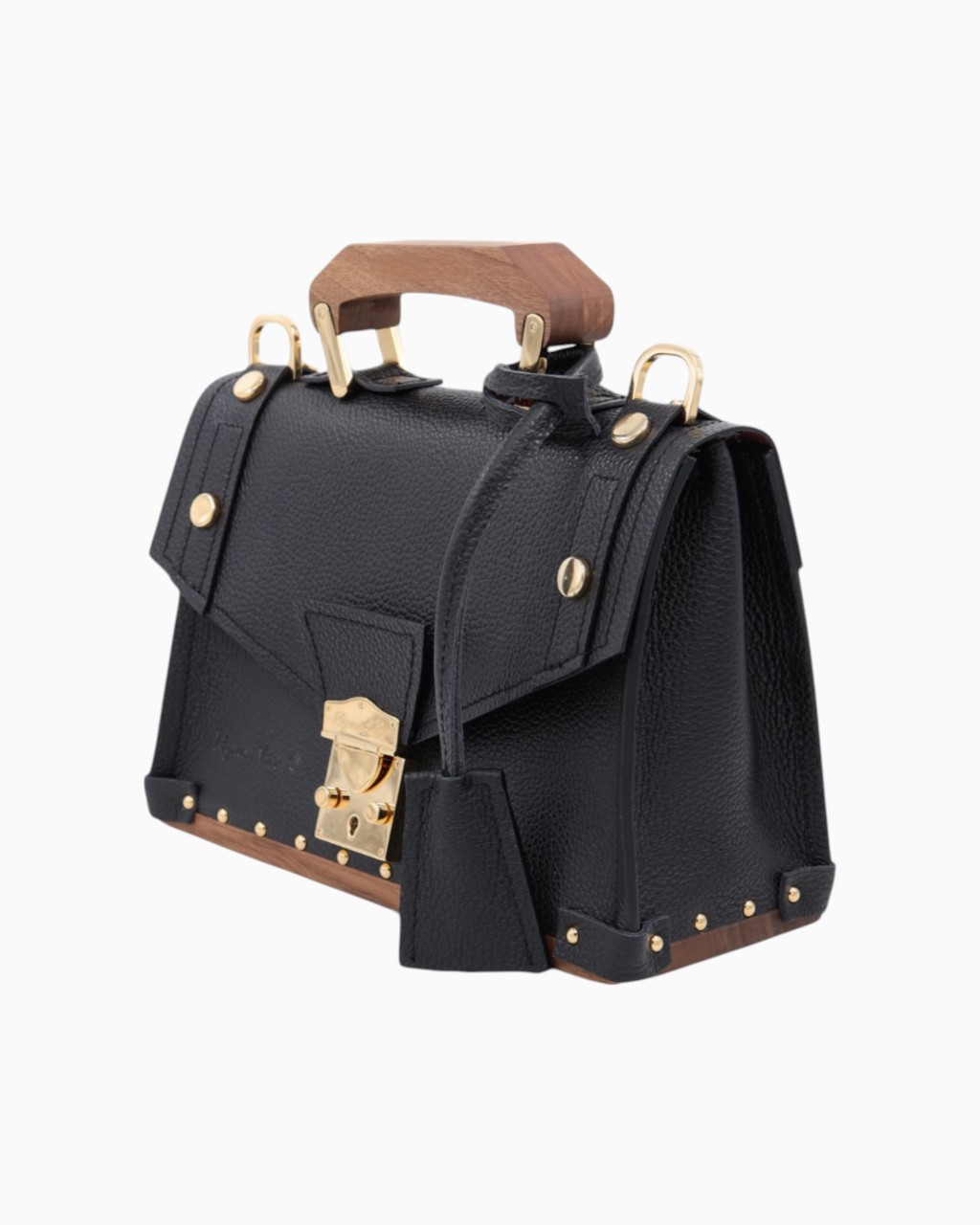 Ce sac est confectionné avec un cuir italien grainé de la plus haute qualité, doublé sur ses deux faces pour une finition impeccable. Le fond, la poignée et la boucle de la bandoulière sont réalisés en bois de noyer, apportant une signature naturelle et élégante. Les détails métalliques, tels que le fermoir, la boucle, les mousquetons, les anneaux et les clous, sont sublimés par un placage en or 24 carats, témoignant d'un souci constant du détail.