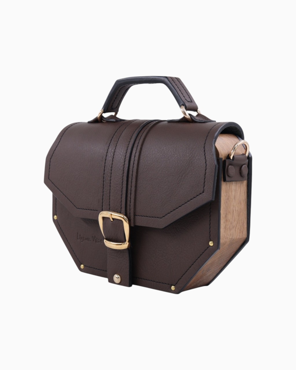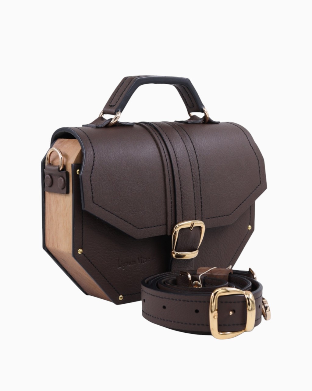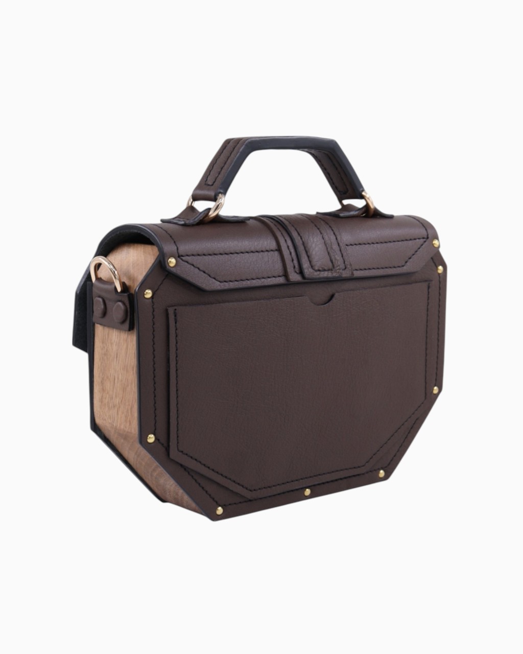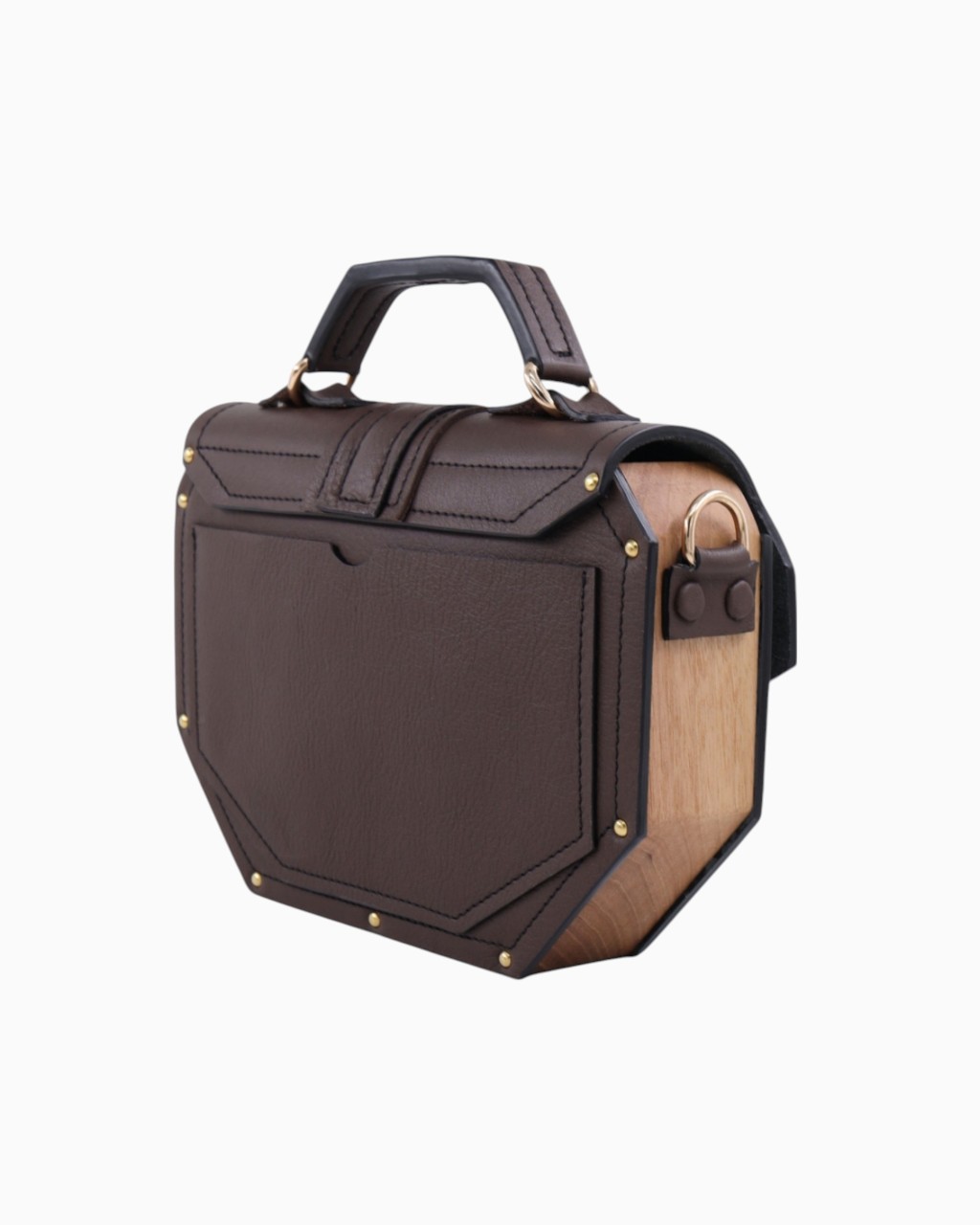 Confectionné en cuir naturel et en bois de noyer d'une seule pièce, il offre un intérieur entièrement doublé de cuir. Pratique et fonctionnel, il est doté d'une poche arrière discrète pour un accès rapide à votre téléphone. Sa poignée cousue en cuir aux angles nets épouse parfaitement la forme du sac, tandis que sa bandoulière réglable permet un porté à l'épaule ou en bandoulière.