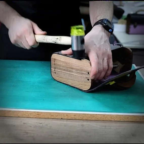 L'assemblage du sac est une étape cruciale où il n'y a pas de place pour l'erreur. C'est une partie de la fabrication qui exige une concentration maximale, des compétences précises et une grande patience. Pour l'assemblage, nous utilisons à la fois des colles et des clous décoratifs qui, en plus de leur fonction de liaison, confèrent au sac un aspect attrayant et une troisième dimension, en plus du cuir et du bois. Bien que cette étape soit essentielle, elle n'est pas finale, car il est nécessaire d'intégrer d'autres éléments métalliques décoratifs ainsi que des fermetures pour le sac.