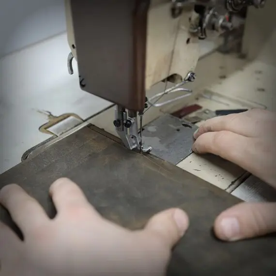 Avant la couture, il est nécessaire d'assembler la doublure intérieure et le cuir, ainsi que de réunir les différentes composantes qui forment le sac en une seule unité. Dans le processus de collage, nous utilisons des adhésifs à base d'eau, non nocifs pour la santé et sans impact négatif sur les matériaux employés. La phase suivante est la couture, qui vise non seulement à relier les pièces, mais aussi à apporter une dimension esthétique, rendant ainsi le produit plus attrayant.
